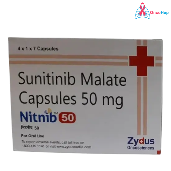Nitnib Capsule (50mg/25mg/12.5mg) is an oral anticancer medication used to treat renal cell carcinoma (kidney cancer), gastrointestinal stromal tumors (GIST), and pancreatic neuroendocrine tumors.