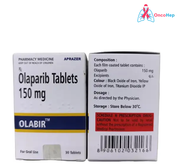 Olabir 150 mg Tablets contain Olaparib, a targeted anticancer medicine used to treat ovarian, breast, pancreatic, and prostate cancers associated with BRCA gene mutations. It works by blocking cancer cell repair and slowing their growth.